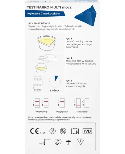 Diather Test Narko Multi Mocz Szybki test panelowy do wykrywania narkotyków w moczu to wyrób medyczny do wykrywania obecności narkotyków w organizmie. Test umożliwia wykrycie aż 7 różnych substancji psychoaktywnych w moczu. Wskazania do wykonania testu: