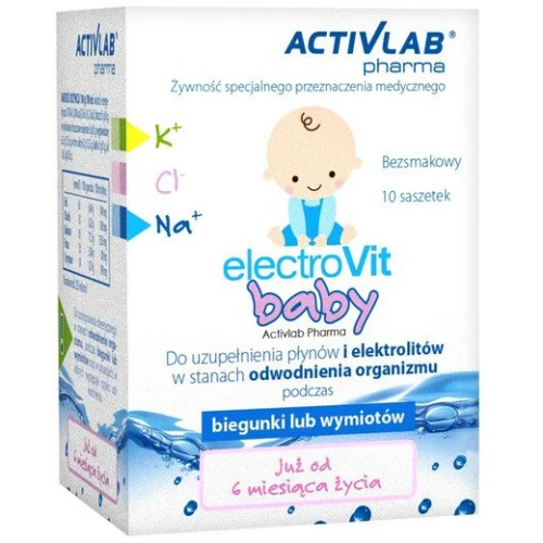 ElectroVit Baby to żywność specjalnego przeznaczenia medycznego w postaci proszku do sporządzenia roztworu. Preparat zawiera kompleks składników takich jak glukoza, cytrynian sodu, chlorek sodu, chlorek potasu. Składniki preparatu pomagają uzupełnić płyny i elektrolity podczas wymiotów i biegunek pochodzenia wirusowego, a także w stanach odwodnienia organizmu. Preparat przeznaczony dla niemowląt powyżej 6. miesiąca życia, dzieci i dorosłych.