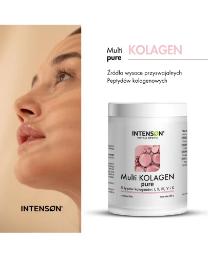 Intenson Multi Kolagen Pure dostarcza pięć typów kolagenu. Kolagen wspiera regenerację skóry, poprawia jej jędrność, nawilżenie i elastyczność.