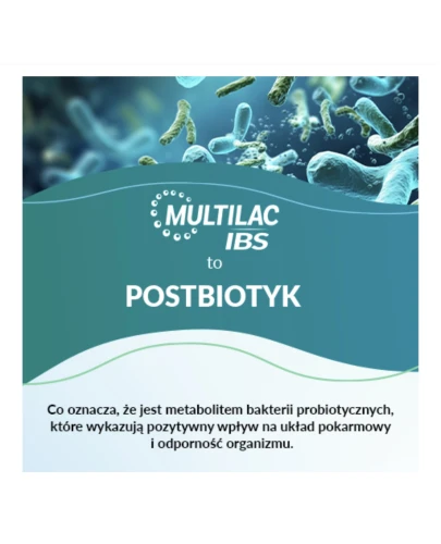 Multilac IBS to żywność specjalnego przeznaczenia medycznego do postępowania dietetycznego w postaci kapsułek doustnych. Produkt zawiera maślan sodu, który rekomendowany jest do stosowania przy zespole jelita drażliwego (IBS) oraz przy innych zaburzeniach czynnościowych jelit. Preparat przeznaczony dla osób dorosłych oraz dzieci powyżej 7. roku życia. Musi być stosowany pod nadzorem lekarza.