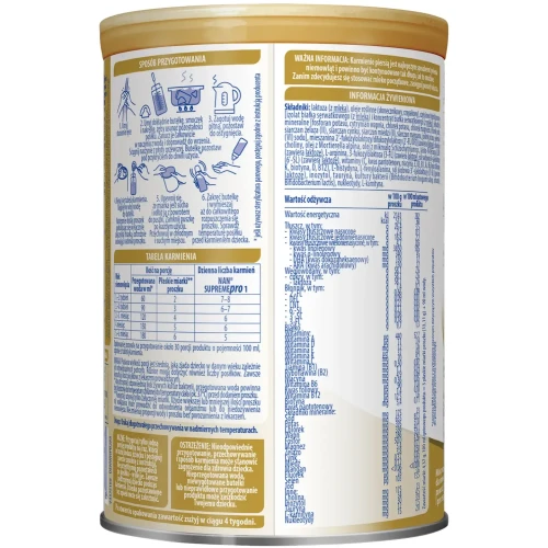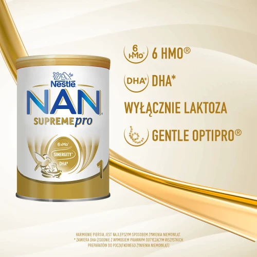 Nestle NAN SupremePro 1 to dietetyczny środek spożywczy specjalnego przeznaczenia żywieniowego. Mleko początkowe w proszku dla niemowląt od urodzenia. Zawiera kompozycję 6 oligosacharydów: 2'-FL, DFL, LNT, 3'-SL, 6’-SL, 3-FL. Powstało z zastosowaniem technologii GENTLE OPTIPRO, która pozwala uzyskać częściowo hydrolizowane białko. Mleko w pełni zaspokaja potrzeby żywieniowe niemowląt od urodzenia, które z różnych przyczyn nie są karmione piersią.