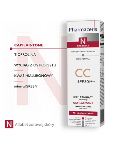 Pharmaceris N Capilar-Tone CC krem tonujący do twarzy, z filtrem SPF 30 i zielonym pigmentem korygującym zaczerwienienia i niwelującym widoczność naczynek.
