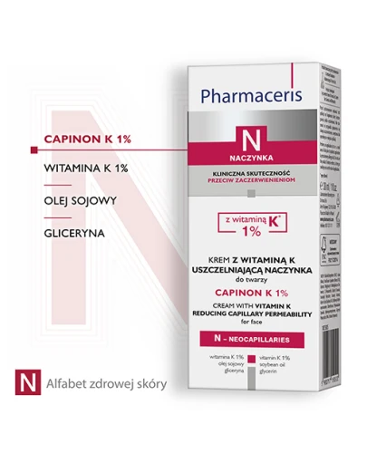 Krem Pharmaceris N Capinon K 1% to produkt kosmetyczny z witaminą K do pielęgnacji i ochrony skóry wrażliwej z rozszerzonymi naczynkami i tendencją do okresowej nadreaktywności, pojawiającej się pod wpływem czynników zewnętrznych jak nagłe zmiany temperatury, silne emocje, spożycie alkoholu i ostrych przypraw. Polecany również do stosowania przed i po zabiegach medycznych i kosmetycznych w celu wzmocnienia naczynek i redukcji zaczerwienień oraz przyspieszenia procesu regeneracji skóry. Może być stosowany także przez osoby z tendencją do zasinień, wylewów podskórnych, wynaczynień i cieni pod oczami oraz profilaktycznie dla skóry ze skłonnością do trądziku różowatego.