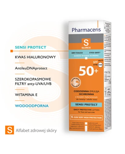 Pharmaceris S Sensi Protect SPF 50+ Emulsja ochronna do twarzy o bardzo lekkiej konsystencji. Zapewnia bardzo wysoką ochronę przed szerokim spektrum szkodliwego promieniowania słonecznego oraz optymalne nawilżenie. Formuła rekomendowana dla skóry wrażliwej i alergicznej, mieszanej z tendencją do przetłuszczania się.