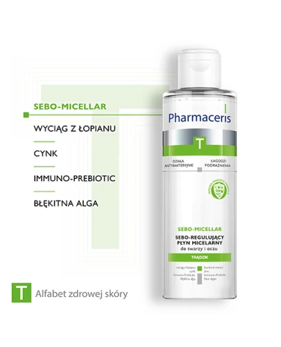 Płyn milcelarny Pharmaceris T Sebo-Micellar to produkt kosmetyczny do oczyszczania twarzy i oczu dla skóry ze skłonnością do trądziku i nadmiernego wydzielania sebum. Redukuje niedoskonałości, odblokowuje pory oraz reguluje florę bakteryjną skóry, zmniejszając podrażnienia i zaczerwienienia. Odpowiedni w każdym wieku.