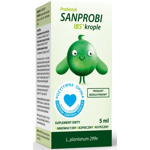 Sanprobi IBS to suplement diety w postaci kropli. Preparat zawiera w kapsułce szczep żywych bakterii Lactobacillus plantarum 299v. Co więcej, probiotyk ze szczepem bakteryjnym utrzymuje i wspiera pracę bariery jelitowej. Preparat przeznaczony dla dzieci powyżej 1 roku życia.